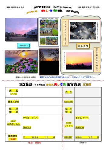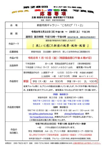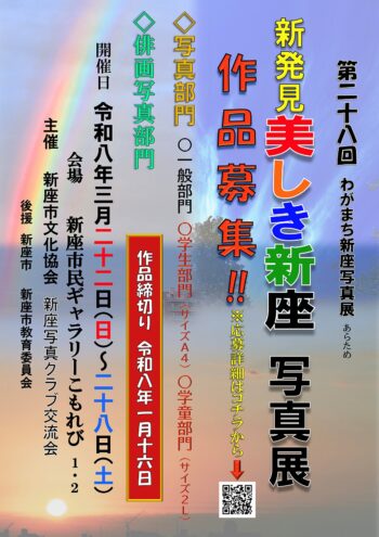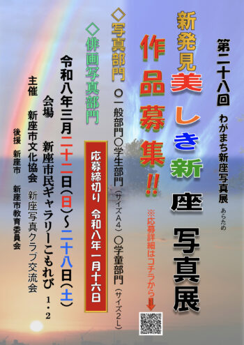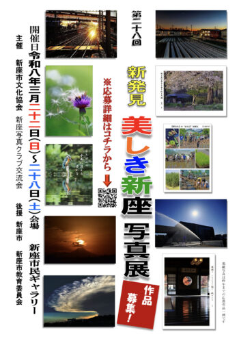 わが町新座写真展をあらため、公募展”美しき新座写真展”の開催は今回で3回目となります。「わが町新座写真展」からの通算回数は第28回目の写真展となります。この間延べ2000名ほどの参加者で歴史は綴って参りました。残念なが昨今昨今会員メンバーの高齢化が進み、写真展を維持していくだけのパワーが足りなくなって参りました。そこで町の変化を追うと作品作品内容を、「再発見 美しき新座」をテーマとして、新しい新座の魅力を映し出していただく方向に変更しました。